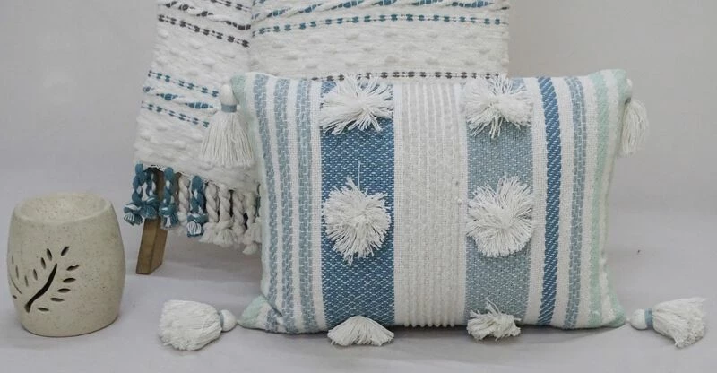 14×20 in handwoven striped pillow with large poms and corner tassles. 95% Cotton, 5% Polyester. Includes: 1 Decorative Pillow with high quality insert. Added Corner Tassels. Back of the pillow has solid color with no pattern. Spot Clean only. Designed in USA. Zipper Closure for easy removal of insert. Indoor Use Only
