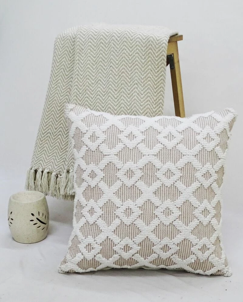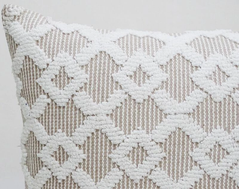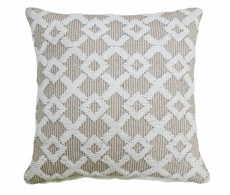 20×20 in machine woven geo texture accent pillow. Front:80% Polyester, 20% Cotton, Back: 100% Cotton. Includes: 1 Decorative Pillow with high quality insert. Added Corner Tassels. Back of the pillow has solid color with no pattern. Spot Clean only. Designed in USA. Zipper Closure for easy removal of insert. Indoor Use Only