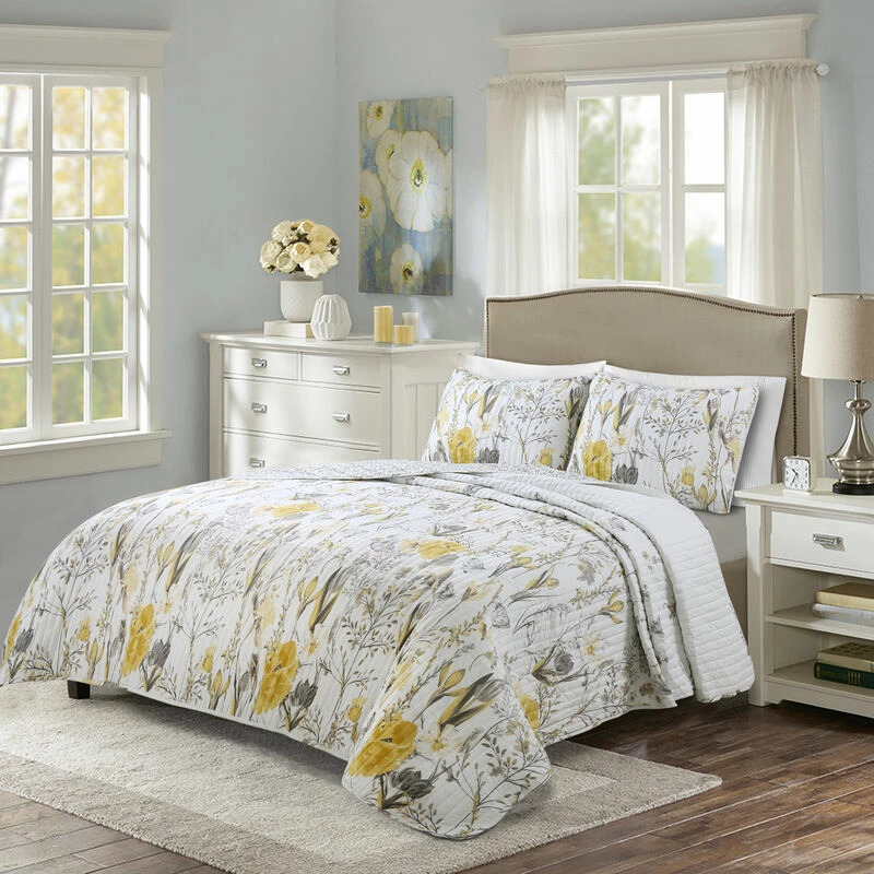 Transform your bedroom into the calm and peaceful escape from the world that you need with this lovely reversible quilt set. The charming floral pattern will brighten the bedroom without overwhelming the design. The set includes the quilt and 2 shams.