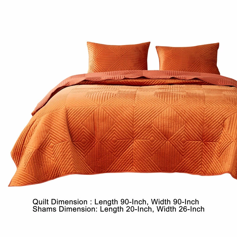 Ahab 3 Piece Velvet King Quilt Set, Diamond Quilting Design, Violet-Benzara