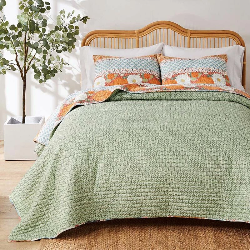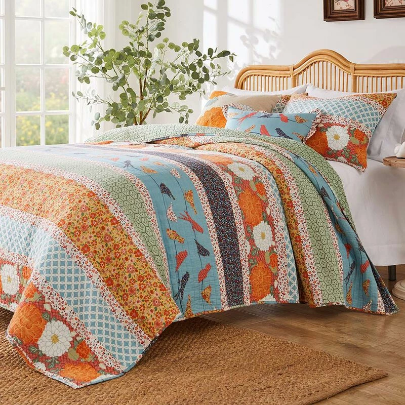 Brighten your bedroom with the fresh, updated colors of this striped print bedding by Barefoot Bungalow. An eclectic blend of dreamy calico patterns in gold, blue, orange, and green creates a cheerful mood. This enchanting quilt set features bright florals and whimsical songbirds and reverses to an all-over coordinating geometric print in green. Vermicelli quilting throughout adds texture and surface interest. Reversible pillow sham(s) complete the look. Oversized for better coverage on today’s deeper mattresses. Prewashed with extra softener for a silky feel and preshrunk for size resilience with fabric bound edges. The quilt set comes with a quilt and two pillow shams (one sham per Twin set). Dimensions: The twin set comes with a 68″x88″ quilted coverlet, plus one 20×26-inch quilted pillow sham. All dimensions +/- 2”. 100% Cotton face; 100% microfiber polyester back; Cotton-rich fill is 60% cotton/40% polyester. Machine Wash. Imported.