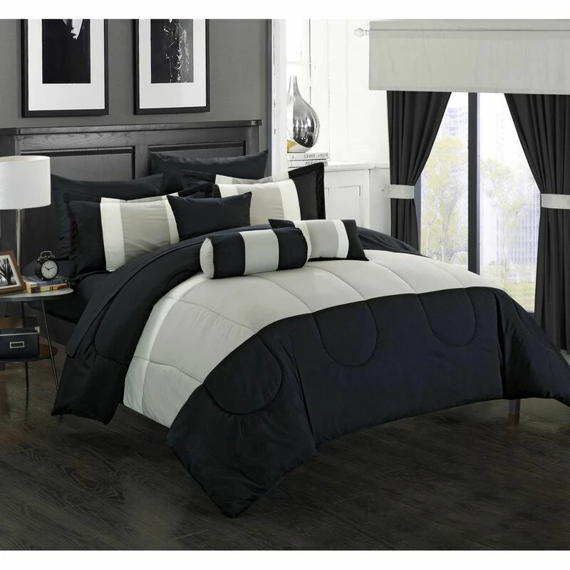 Chic Home CS1888-US 20 Piece Standon Complete Pieced Color Block Bedding, Sheets, Window Panel Collection Queen Bed in a Bag Comforter Set, Black Sheets