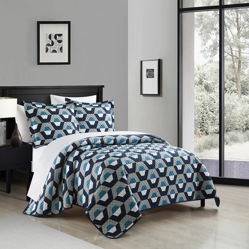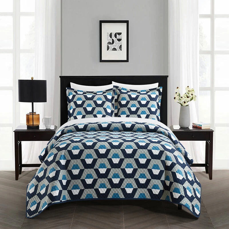 Experience the contemporary design you would expect from a high-rise hotel in the comfort of your own bedroom. The Arthur quilt set from Chic Home features a unique, geometric hexagon pattern print and exudes an understated style that can transport you from the moment you set foot in the room. Two design-coordinated pillow shams complete this one-of-a-kind set. Give your bedroom a fresh, clean look with the unique style of the Breana quilt set from Chic Home. Complete the set with the included design-coordinated pillow shams or mix and match with your own pieces for a unique look. Specifications: Size: Twin, Color Scheme: Blue, Piece Count: 2, Set Includes 1 Piece Geometric Pattern Print Quilt (66” x 90”), 1 piece Geometric Pattern Print Pillow Shams (20” x 26″ + 2″), Materials: Luxuriously brushed microfiber fabric, synthetic down alternative filling, Fabric and Design: Silky soft brushed microfiber cotton-feel material.