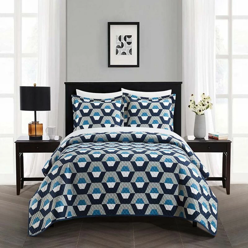 Experience the contemporary design you would expect from a high-rise hotel in the comfort of your own bedroom. The Arthur quilt set from Chic Home features a unique, geometric hexagon pattern print and exudes a sense of understated style that can transport you from the moment you set foot in the room. Two design coordinated pillow shams complete this one of a kind set. Size: Queen, Color Scheme: Blue, Piece Count: 7, Set Includes: 1 Piece, Geometric Pattern Print Quilt (90” x 90”), 2 Piece Geometric Pattern Print Pillow Shams (20” x 26″ + 2″), 1 Piece White Microfiber Flat Sheet (90” x 102” + 4″), 1 Piece White Microfiber Fitted Sheet (60” x 80” + 12”), 2 Piece White Microfiber Pillowcases (20” x 30”), Materials: Luxuriously brushed microfiber fabric, synthetic down alternative filling