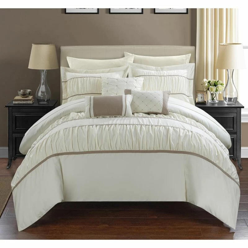 Ruffles and Ruching is this extremely sophsticated Bed in a bag comforter set is all about. Supersoft brushed microfiber, pleated details will and create pure luxury on any bed. Detailed ruffled and Ruching technique are extemely luxurious details that complement any decor and add old world charm to any guest or master suite. This also comes with a supersoft microfiber sheet set to complete the look.