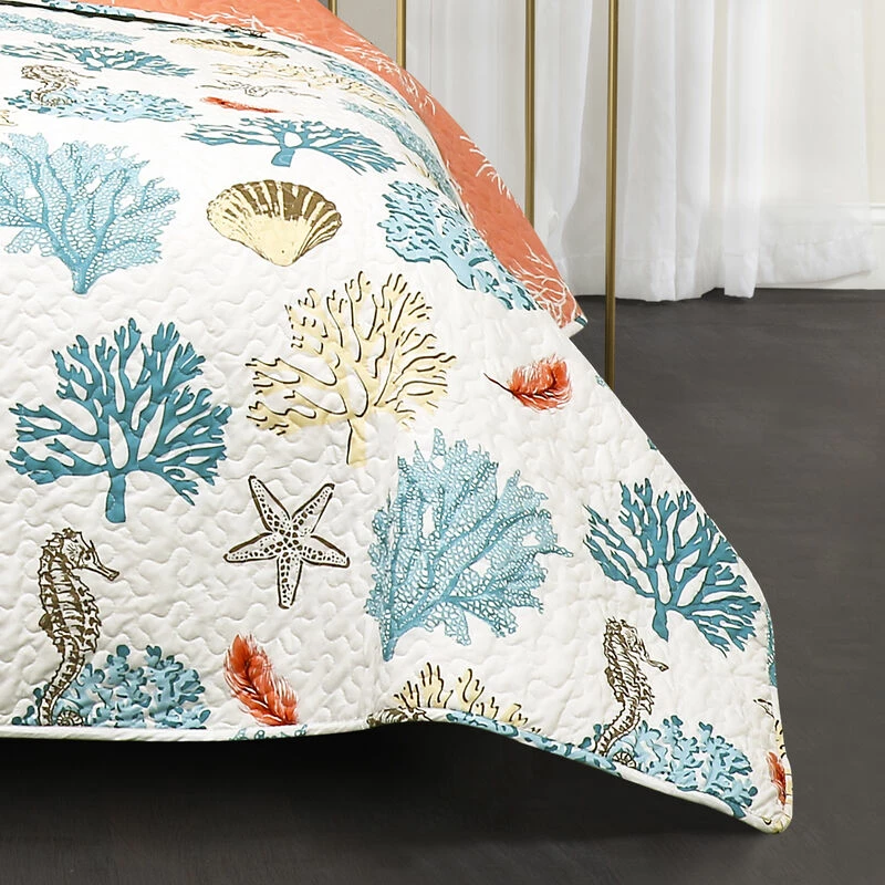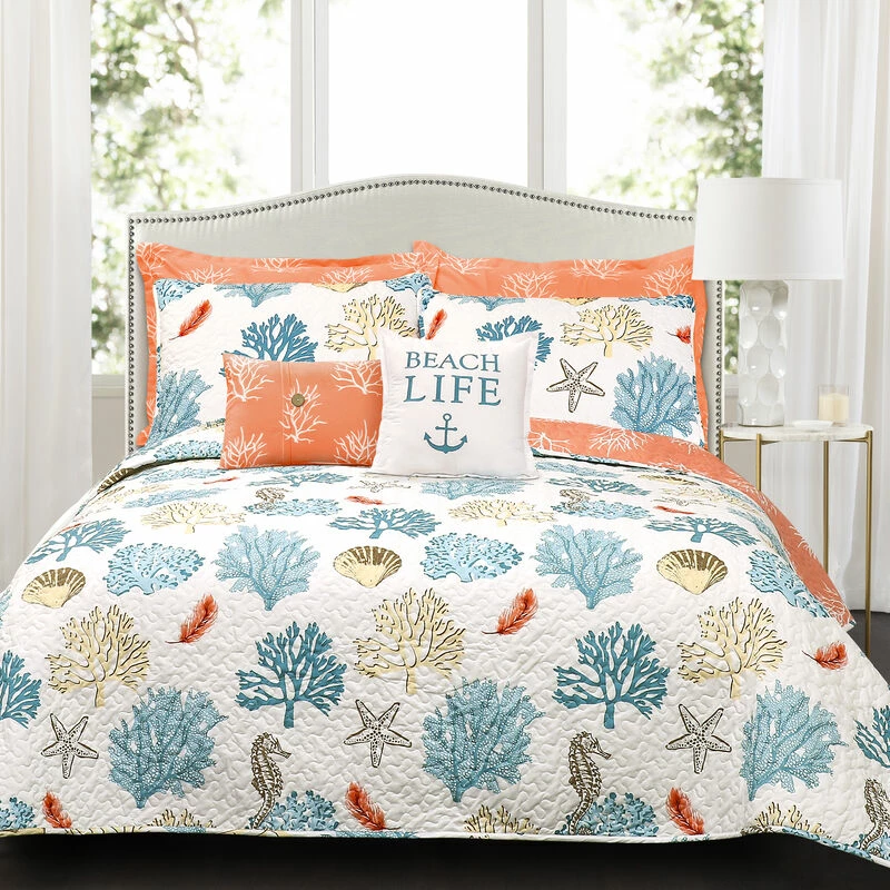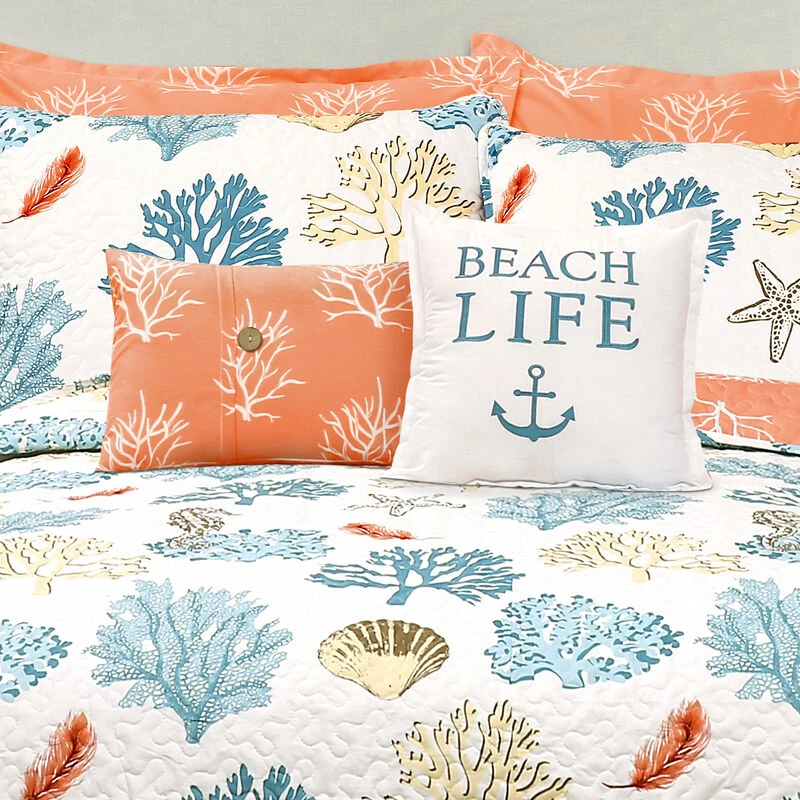 Coral reefs and feathers combine to create a stunning reversible quilt set perfect for your beach home or your beach-themed bedroom. The 7-piece set comes complete with 2 matching pillow shams, 2 pillow cases and 2 complementary decorative pillows.