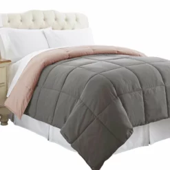 Genoa Twin Size Box Quilted Reversible Comforter The Urban Port, Gray And Pink-Benzara