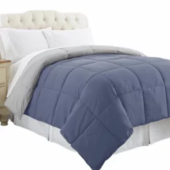 Genoa Reversible King Comforter With Box Quilted The Urban Port, Silver And Blue-Benzara