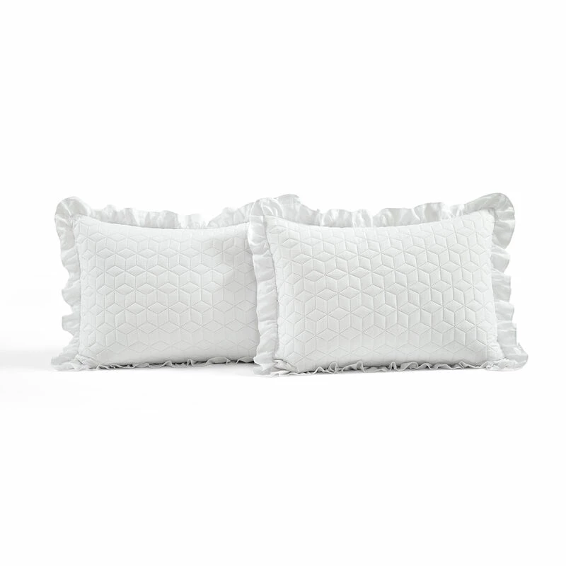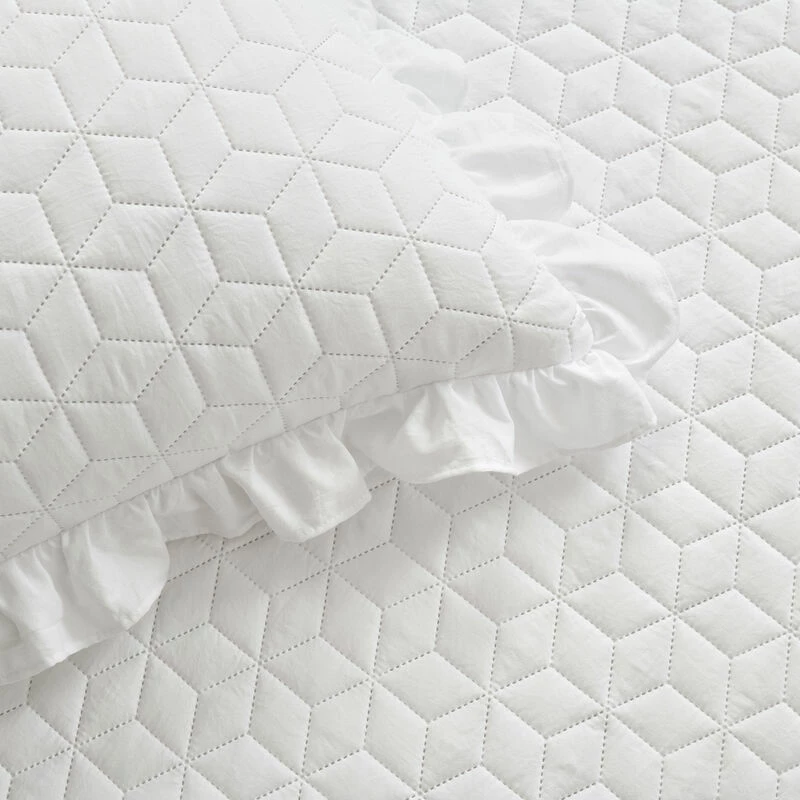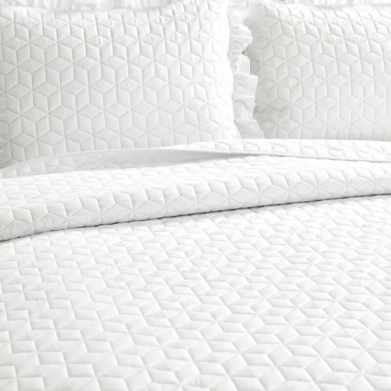 Refresh your master or guest bedroom with this bedspread set featuring embossed geometric quilting detail and fitted ruffle skirt that kisses the floor. This set is made with soft crinkle microfiber and includes 2 matching pillow shams with ruffle trim.