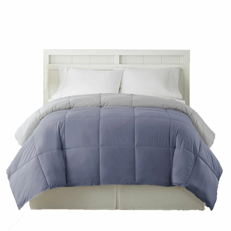 Update your bedroom look in style with the inclusion of this cozy king size comforter. Made from sumptuous and soft down alternative microfiber for a comfortable experience in elegant silver and blue color. It features box quilted details which bestow an appealing look to the comforter. The machine washable feature saves the hassle of dry cleaning while the reversible attribute makes it a versatile and comfortable companion to your bed.