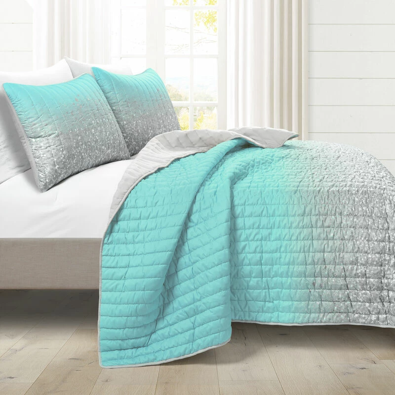 You can never go wrong with glitter! This quilt set is the perfect way to add a glamorous touch to your child’s bedroom. The glitter ombre drips into a stylish fun color is super on trend and a great way to introduce a pop of color. The blend of patterns will seamlessly complement the bedroom’s existing decor. This five piece set includes one quilt, two matching shams, and two pillowcases. This set is machine washable for your convenience. Please refer to label for full care instructions.