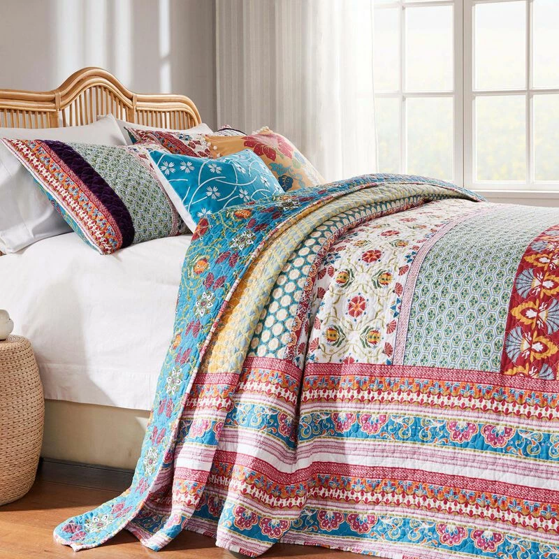 Rows of vivid medallions, stylized florals, and geometric prints create distinctive bohemian styling. The Thalia floor-length bedspread set features mitered borders and multi-fabric construction embellished with velvet bands. Reverses to a coordinating updated floral print on a Caribbean blue ground. Each set comes with a floor-length bedspread and two pillow shams. The Queen set comes with two standard pillow shams. Pillow shams feature an envelope opening on the reverse with cloth ties you can use to hold your pillow in place. Dimensions: The queen set includes one 110×118-inch bedspread and two 20×26-inch pillow shams. All dimensions +/- 2 inches. Face 95% cotton with 5% polyester velvet embellishment; back 100% cotton; fill 60% cotton, 40% polyester. Prewashed for extra softness.