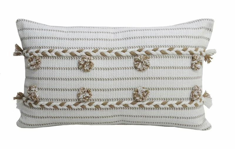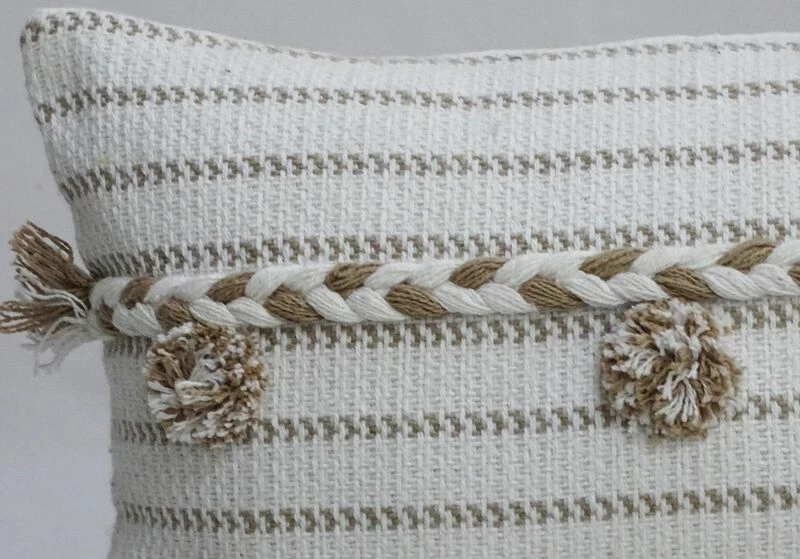 14 inches X 24 inches handwoven pillow with braids & poms100% CottonIncludes: 1 Decorative Pillow with high quality insertColorful accent pillow for Indoor Use OnlyBack of the pillow has solid color with no patternSpot Clean onlyDesigned, filled and finished in the USA Zipper Closure for easy removal of insert.