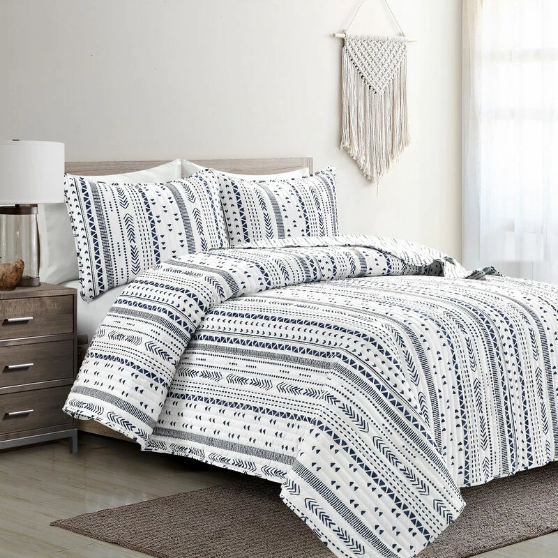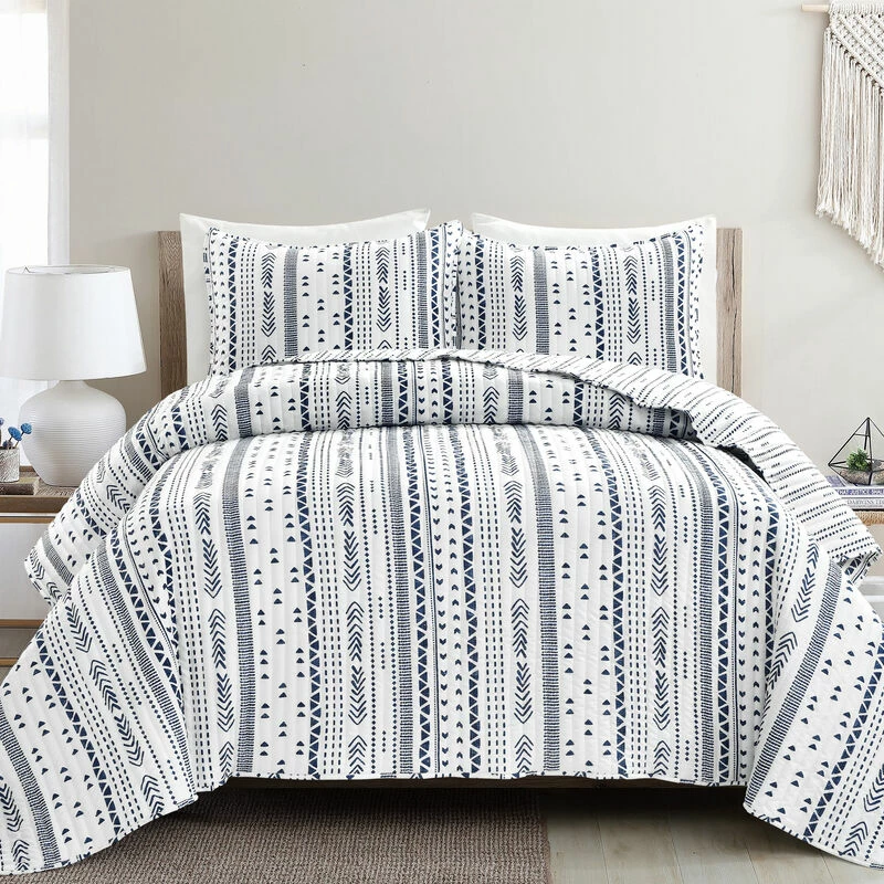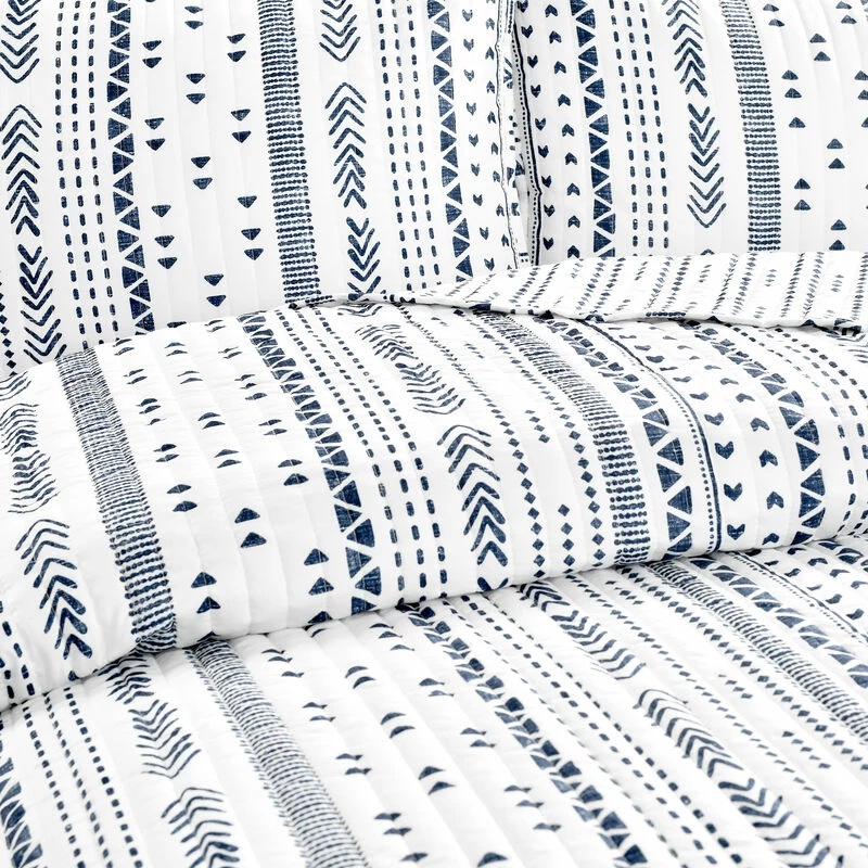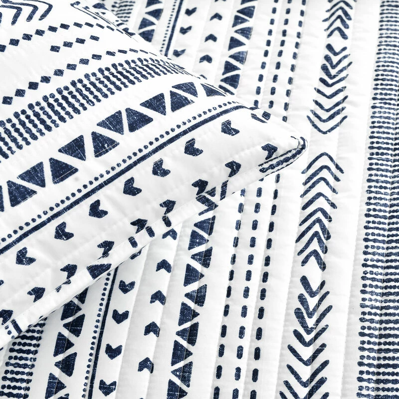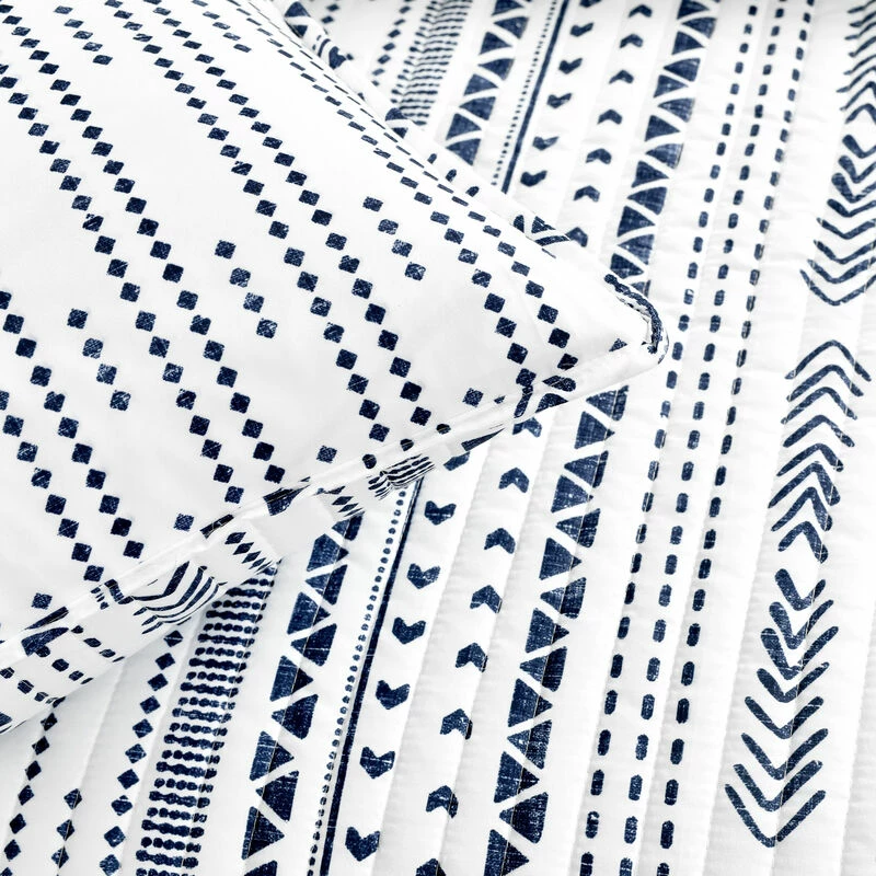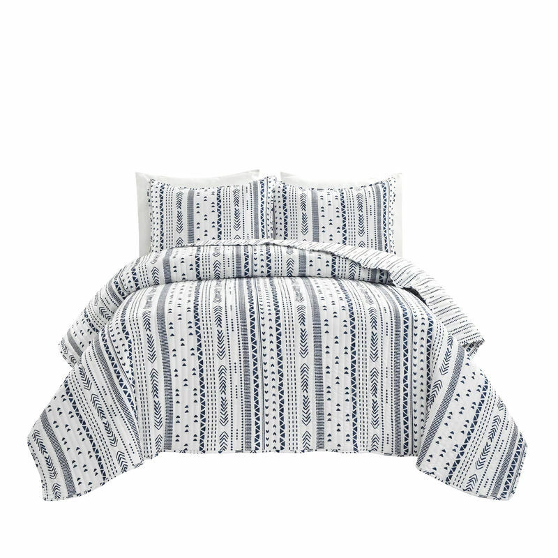 Add Scandinavian style to your home with this reversible quilt set featuring vertical stripes of various geometric patterns. This three-piece quilt set provides the perfect neutral look to create a cozy feeling in your master bedroom or guest bedroom.
