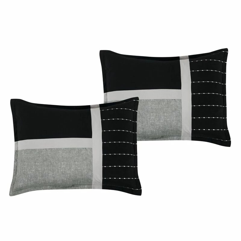 1 comforter 104 by 90 Inches, 2 Shams 20 by 26 Inches,  1 cushion 16 by 16 inches, 1 cushion 18 by 18 inches, 1 Decorative pillow 10 by 20 inches, 1 breakfast pillow 12 by 18 inches
