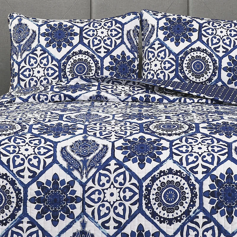 This beautiful cotton reversible quilt set will truly make you “marvel”. The colors and pattern resemble a sea floor, making it perfect for a coastal themed bedroom. The soft colors mute the bold design so it doesn’t take over the look of the bedroom.