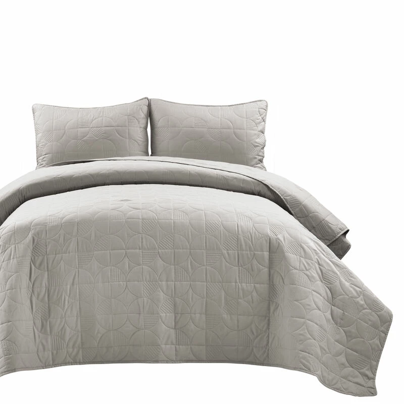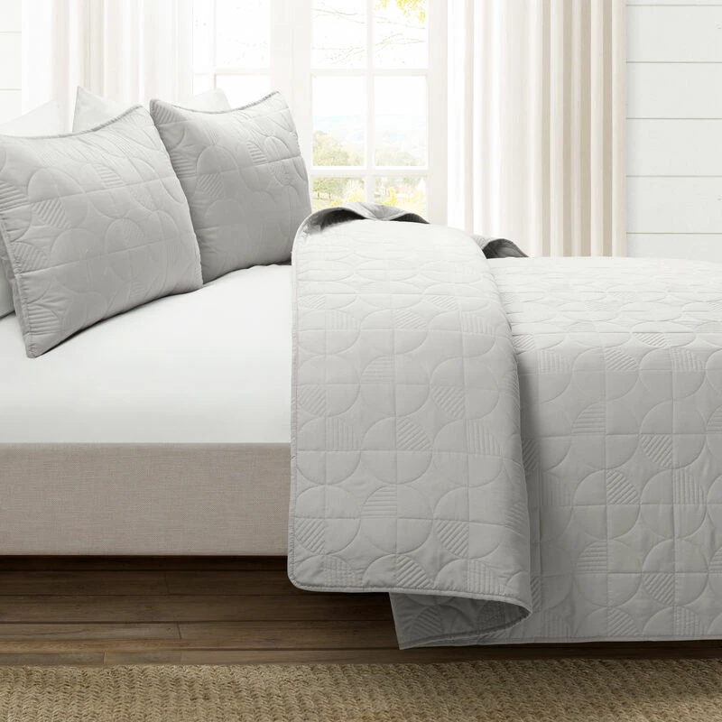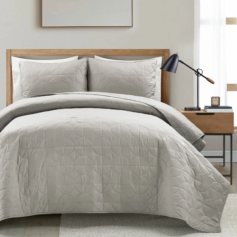 This modern quilt set is perfect for any bedroom — it’s chic, embroidered and reversible. Expertly quilted for a plush and comfortable feel, you’ll love indulging in extra comfort when you wrap yourself up in this oversized 3-piece set. Use it to instantly elevate the bedroom’s decor with its mid-century design, giving off a contemporary vibe to your space. Step into the cozy cotton warmth of your bed with this quilt and enjoy sweet dreams of softness and relaxation each night. This bedding set includes one quilt and two shams with a matching embroidered design and solid cotton backing. Each sham has a standard envelope opening for your convenience. This product is STANDARD 100 by OEKO-TEX® certified, which means the fabric, dyes and all components have been tested in an independent laboratory and certified against a list of more than 350 harmful substances. Please refer to care label for full care instructions.