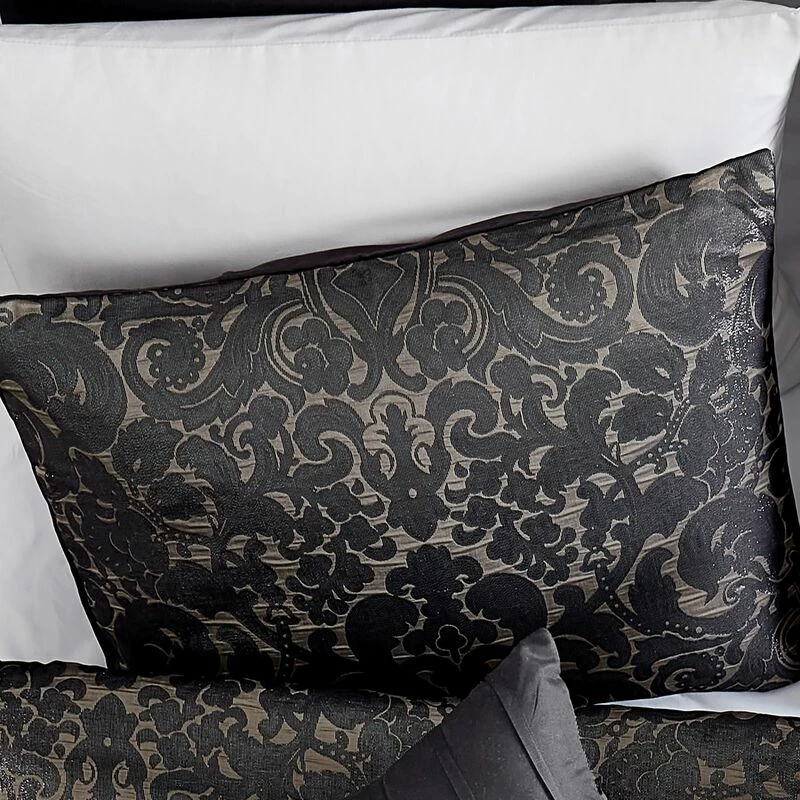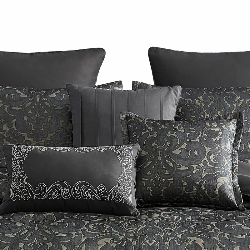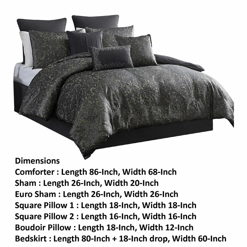 Pixie 9 Piece Polyester King Comforter Set, Damask Pattern, Charcoal Gray-Benzara