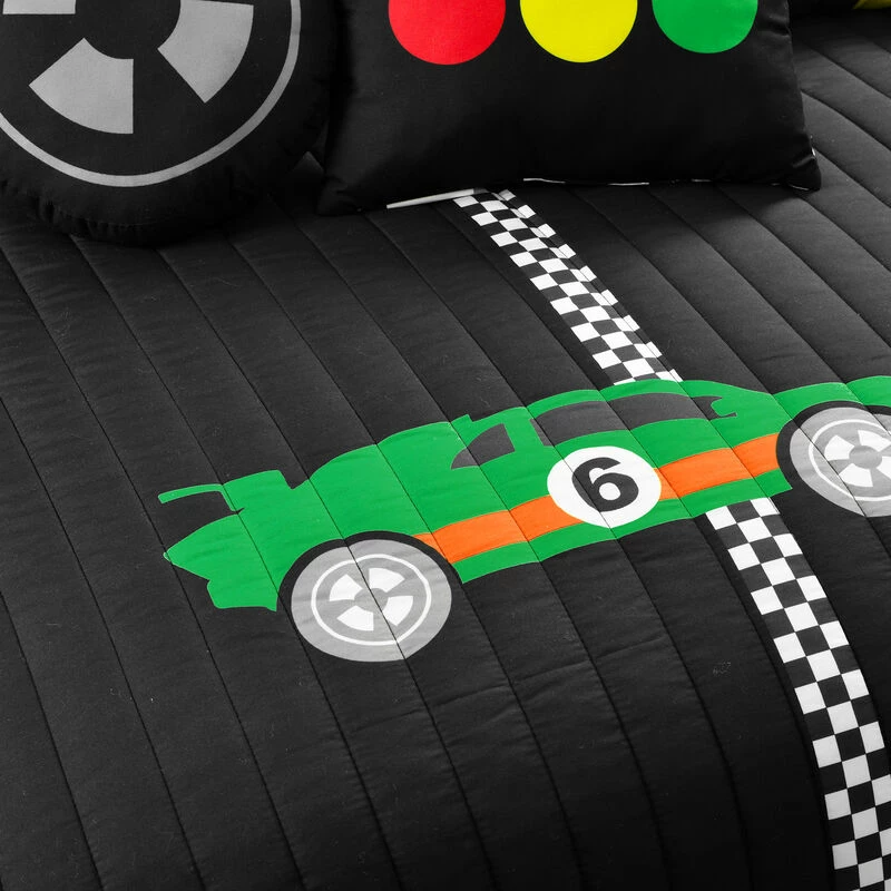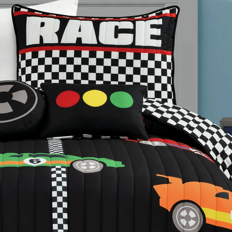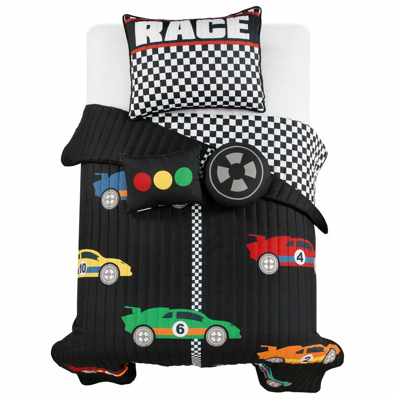 This quilt set is ideal for children and tweens. The cars racing across the finish line will ignite the imagination of anyone lucky enough to have this in his or her bedroom. This unique quilt set includes a soft reversible quilt, matching pillow shams (1 sham for twin, 2 shams for full/queen), and two decorative accent pillows. The two throw pillows compliment the design and give the set a complete and styled look. Conveniently, the quilt and shams are machine washable. The decorative pillows should be spot cleaned. Please refer to the product labels for full care instructions.