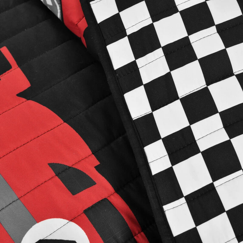 If your child loves to watch fast cars and play vintage car racing video games, this quilt set is perfect for their first big kid bedroom. The front features colorful cars crossing the finish line, while the reverse is the print on the checkered flag.