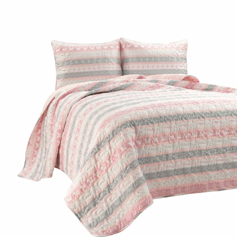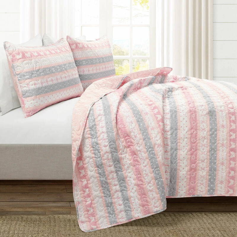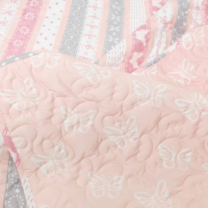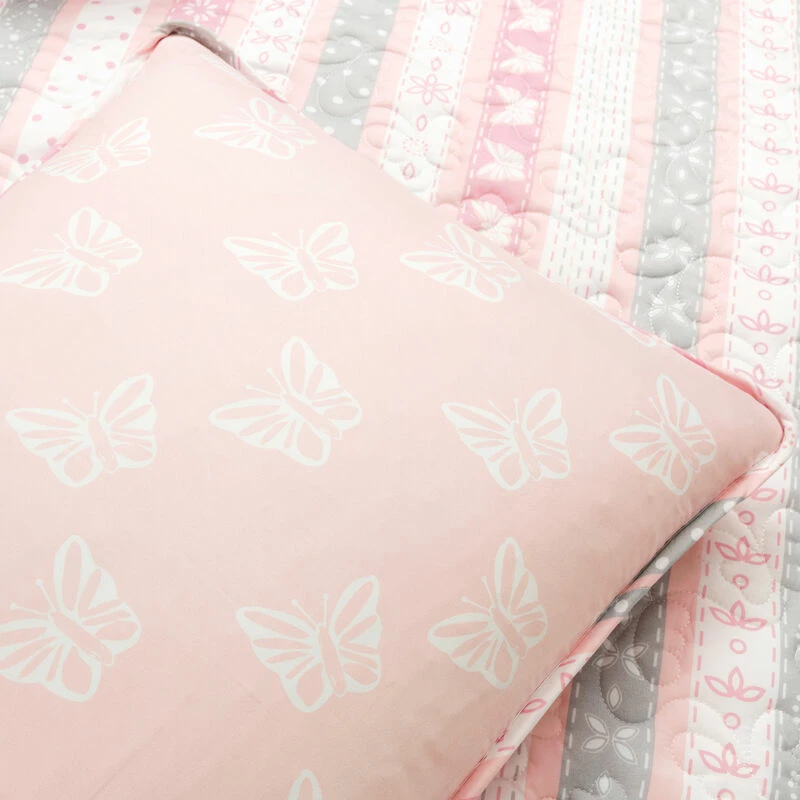 Keep creativity flying in your child’s bedroom with this lovely quilt set of flowers and butterflies. This inspiring pattern brings to life a colorful theme of nature’s beautiful gifts. The reverse of this set gives you the option to change your look with a different pattern of floating butterflies. This set includes the reversible quilt and matching sham(s). Please refer to label for full care instructions.