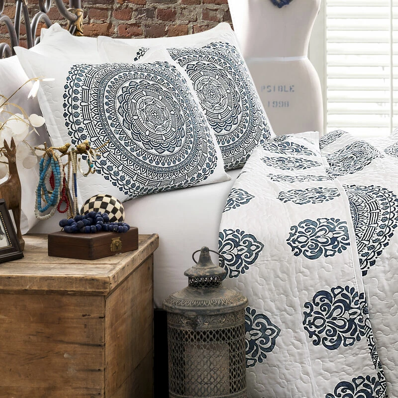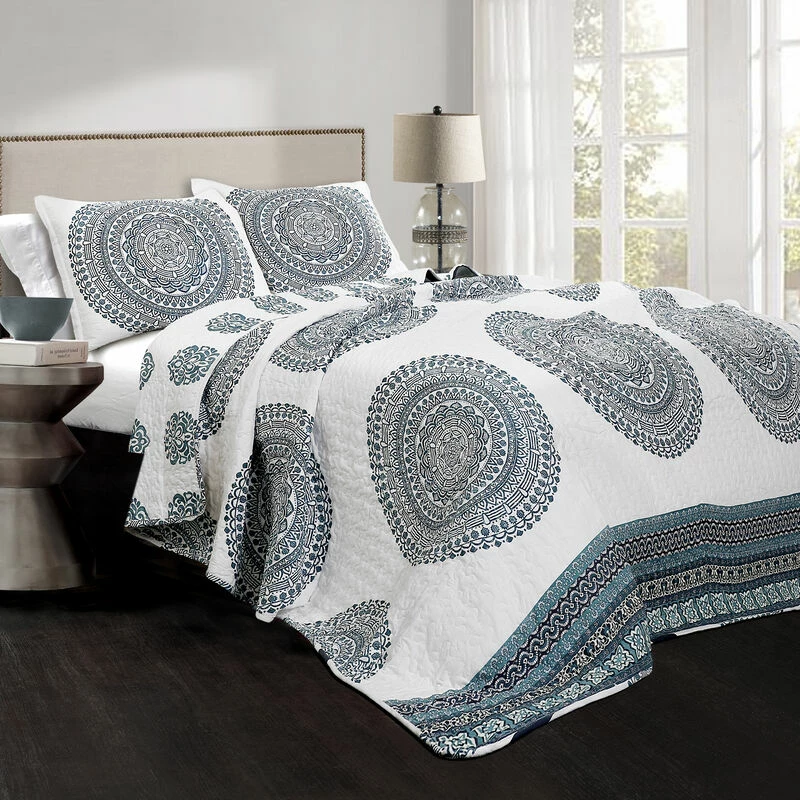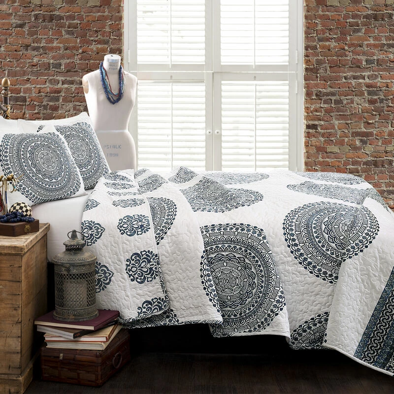 The Shaila Medallion Quilt Set features a pattern of circular medallions and geometric stripes printed on 100% cotton. The reverse includes a print of smaller medallions in matching colors. The three-piece set includes two matching pillow shams.