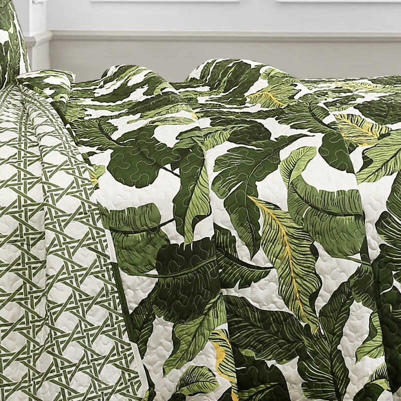 Add life to your bedroom with this Tropical Paradise 5 Piece Quilt Set. The bright and exquisite design will transform your bedroom into a tropical rainforest. It’s ideal for a guest bedroom. Two unique decorative pillows and two shams complete the set.